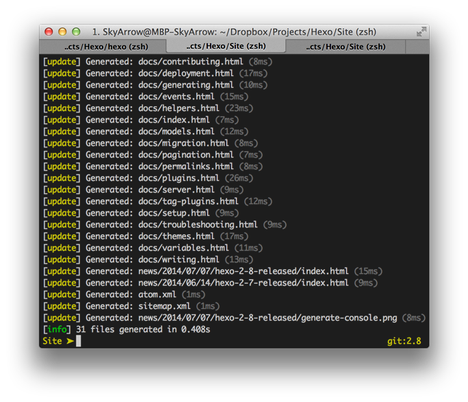 Generating was also changed in Hexo 2.8. You can check the elapsed time of each file in console now. However, I found multi-process generating didn’t affect generating speed a lot. Thus, multi_thread and max_open_file setting are deprecated in Hexo 2.8.